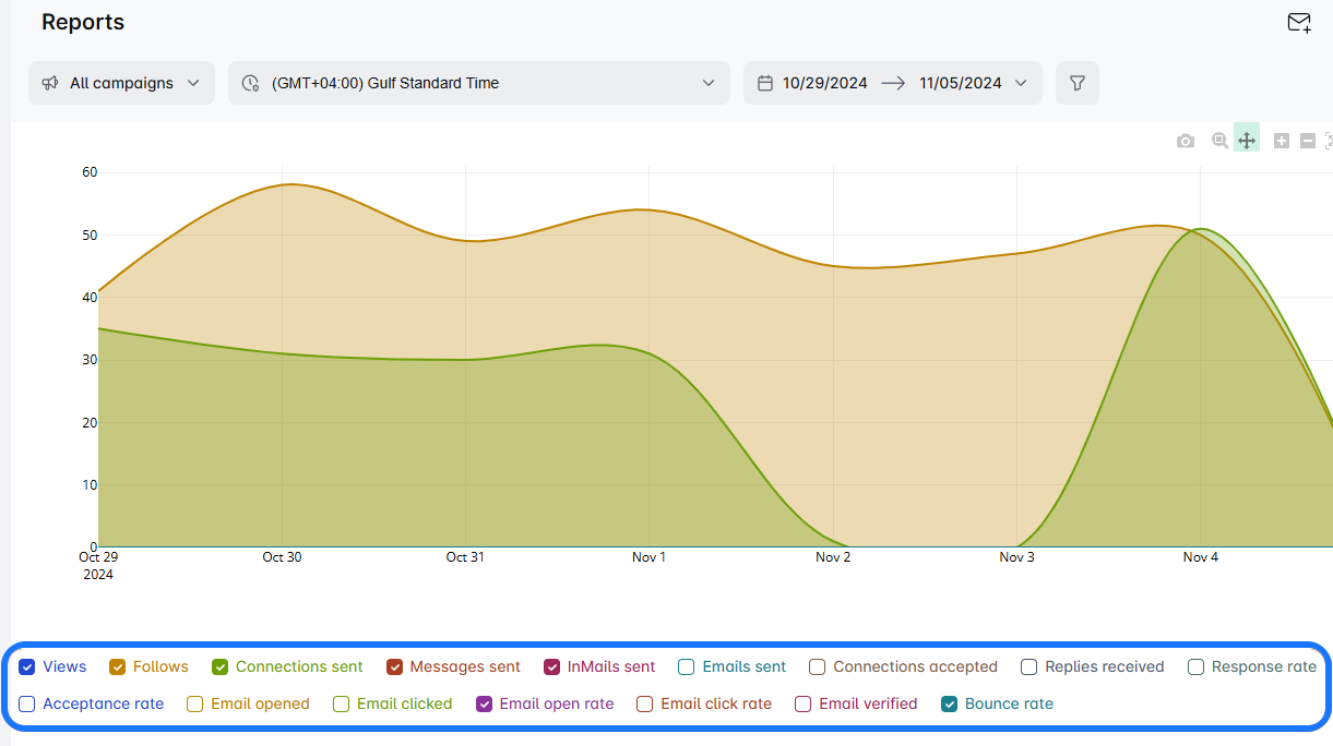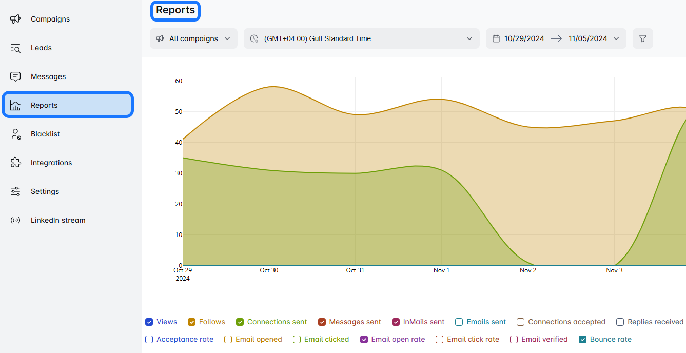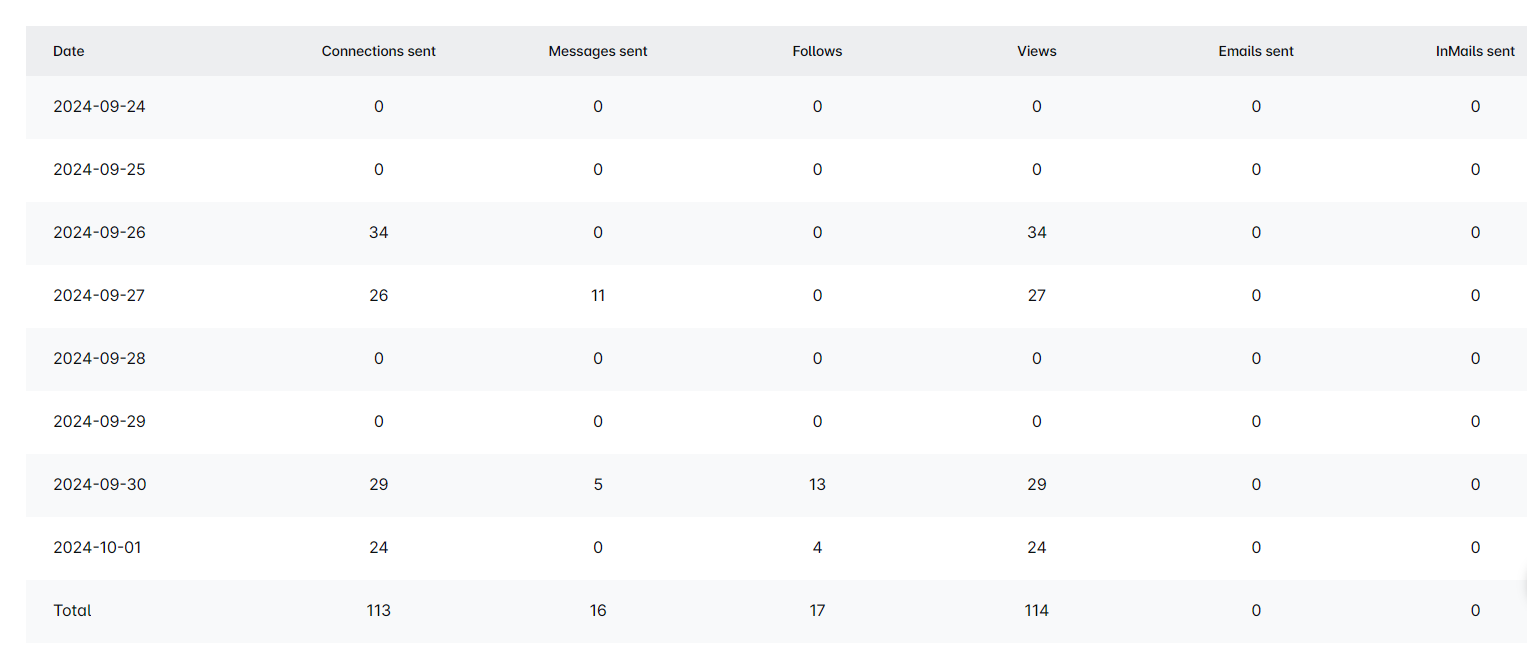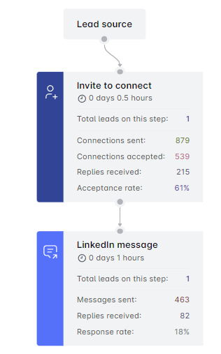 Scroll down for a detailed breakdown of each campaign step. See how many connections were sent, replies received, and emails/messages dispatched by salessky.io. It varies based on your campaign type and the steps included. Easily spot where your leads stand in the campaign.