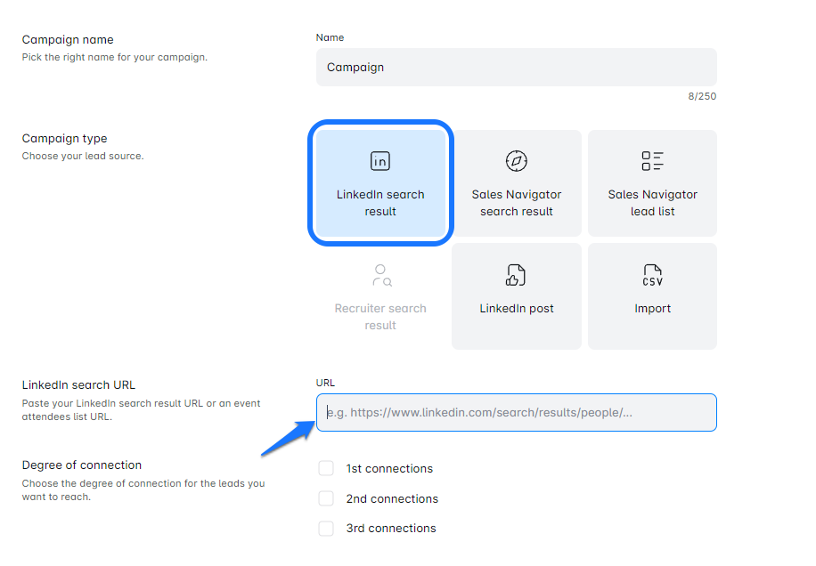 In salessky.io, paste your LinkedIn search URL into the designated area. Give your campaign a name that resonates with your goals.